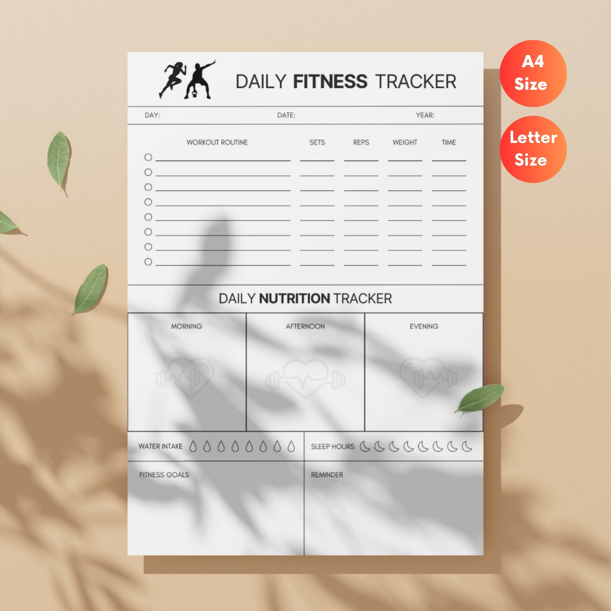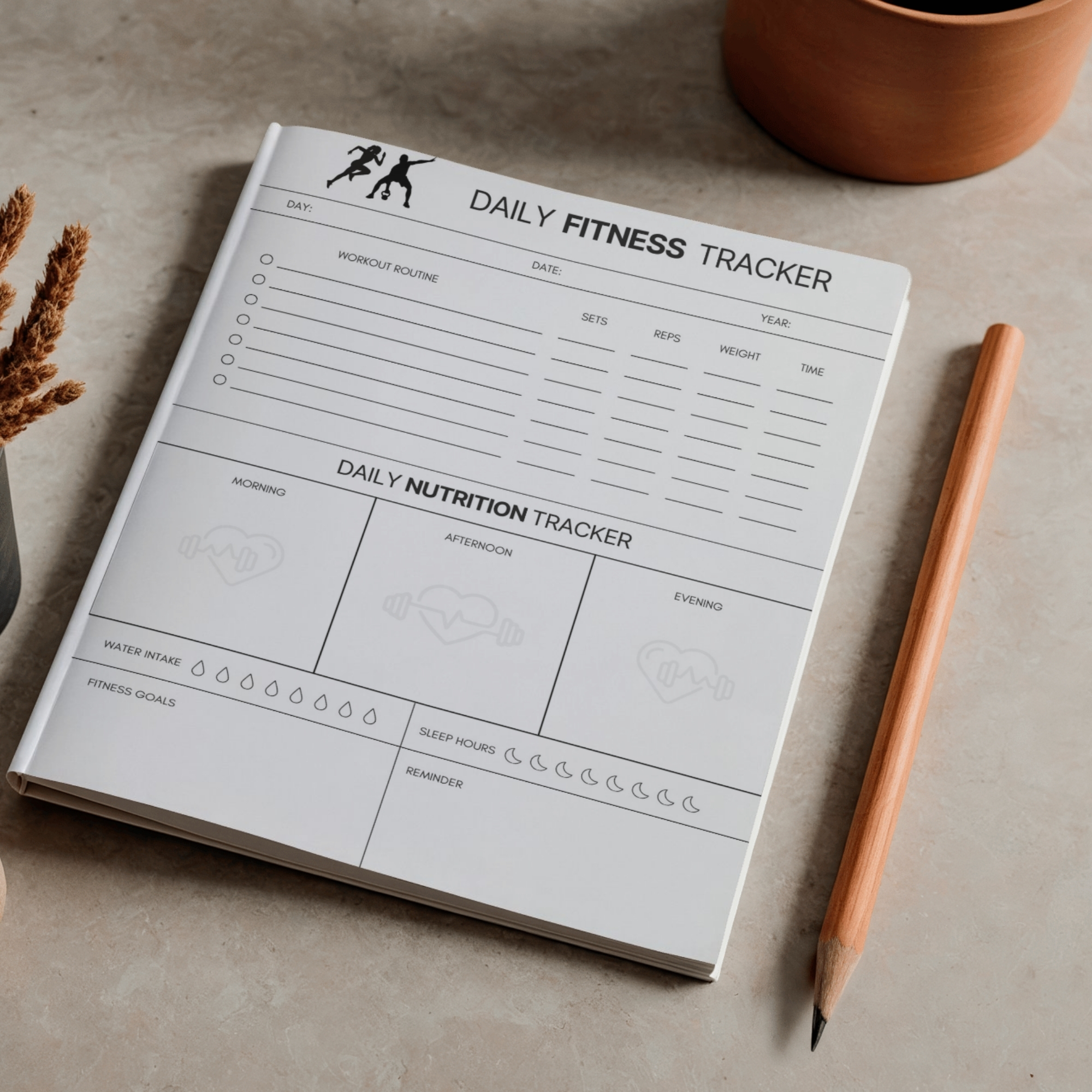 Fitness & Nutrition Tracker Printable | Daily Workout Log, Meal & Water Tracker | TRAC-002-01