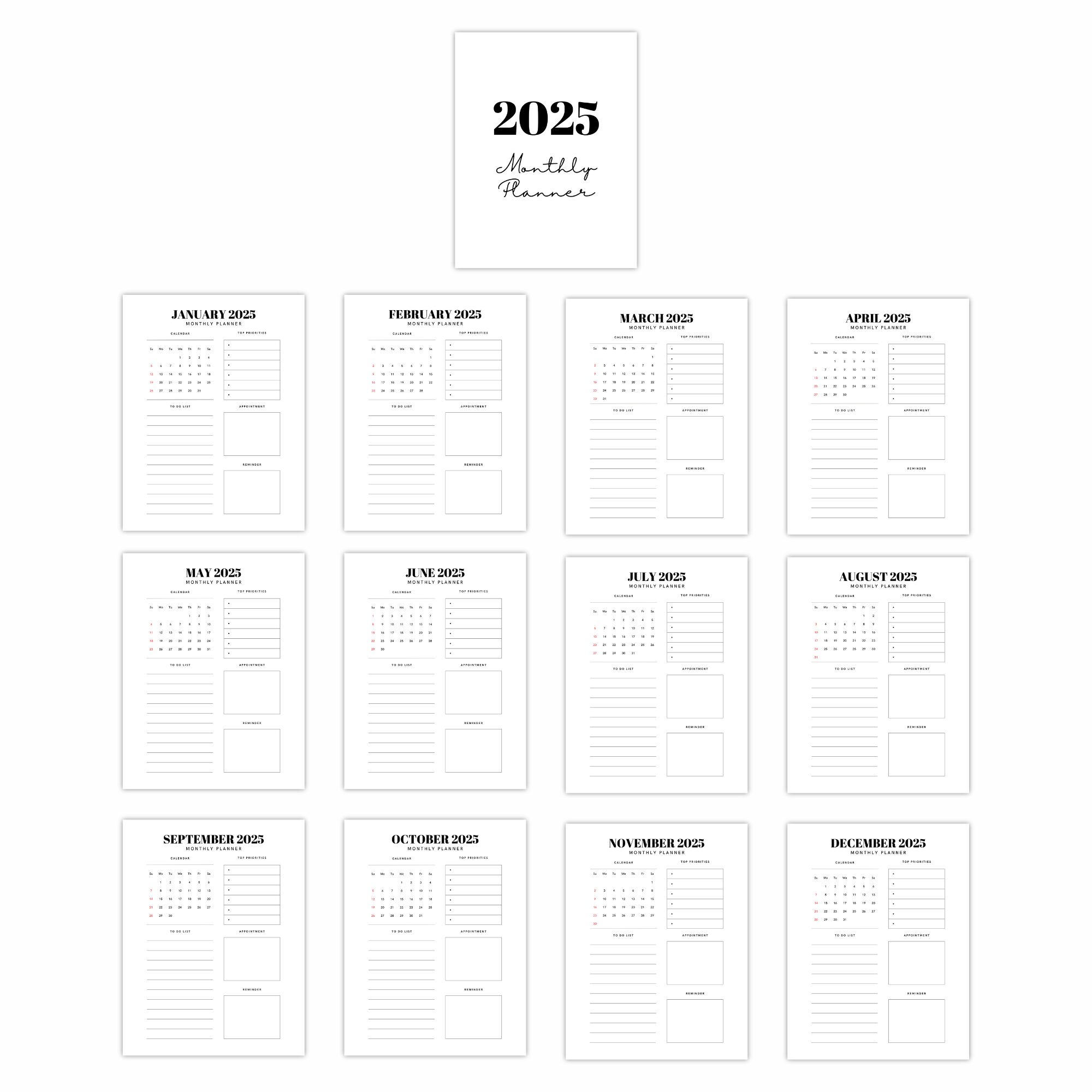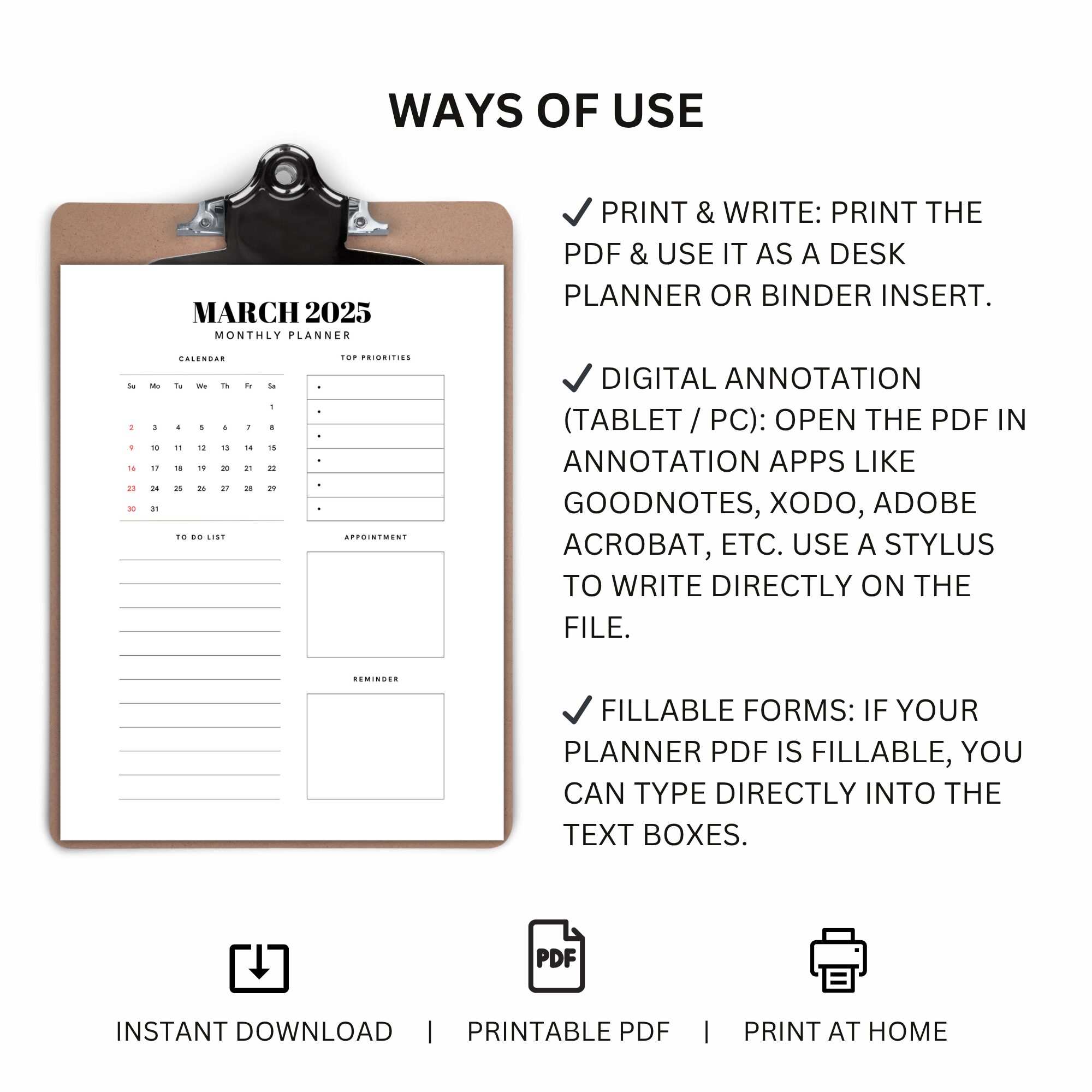 Printable 2025 Monthly Planner | Calendar Organizer with Priorities, To-Do List, Appointments & Reminders | Instant PDF Download
